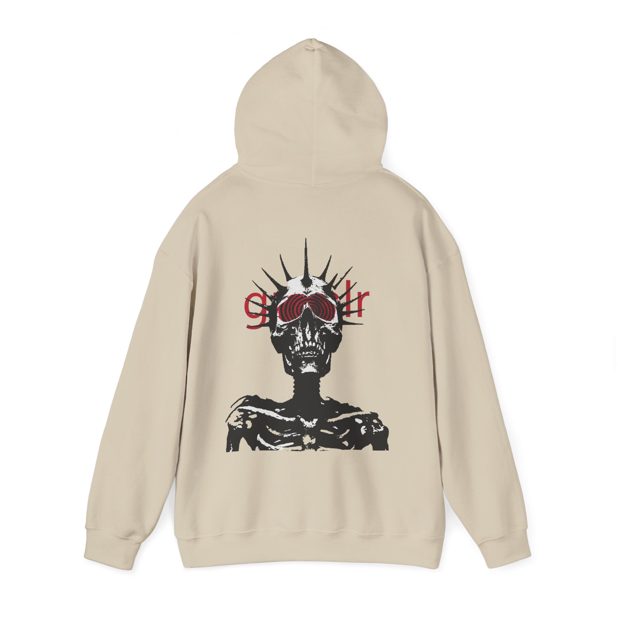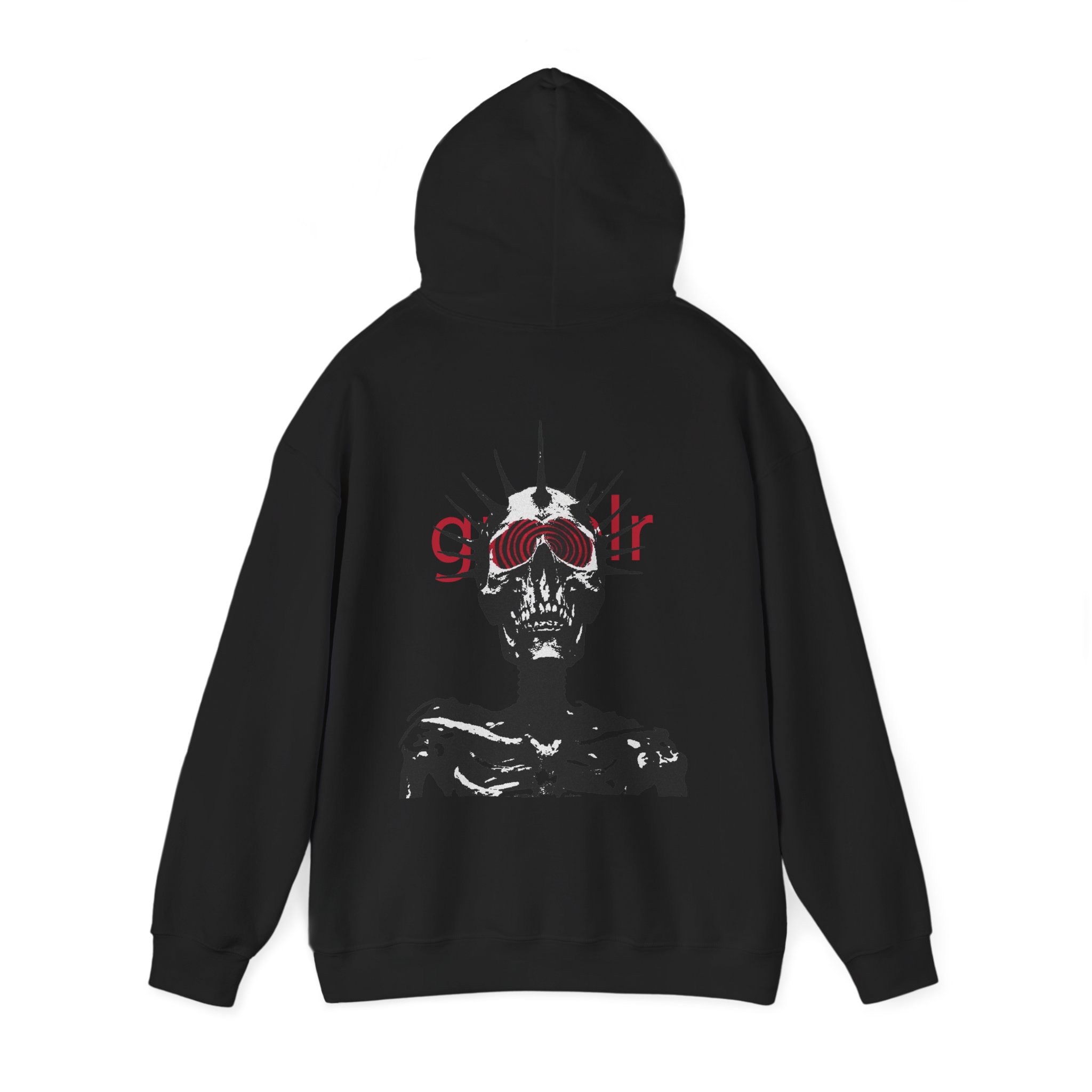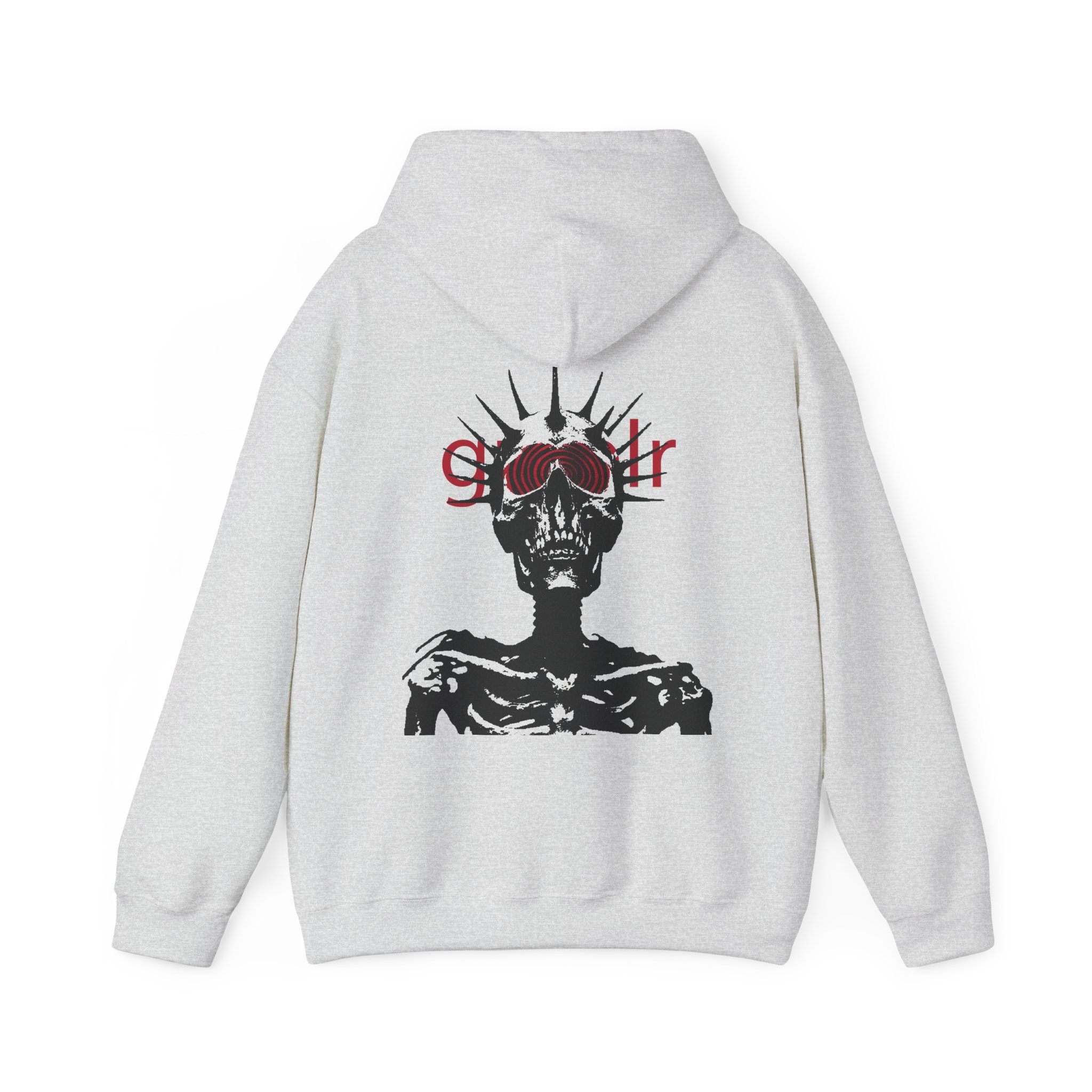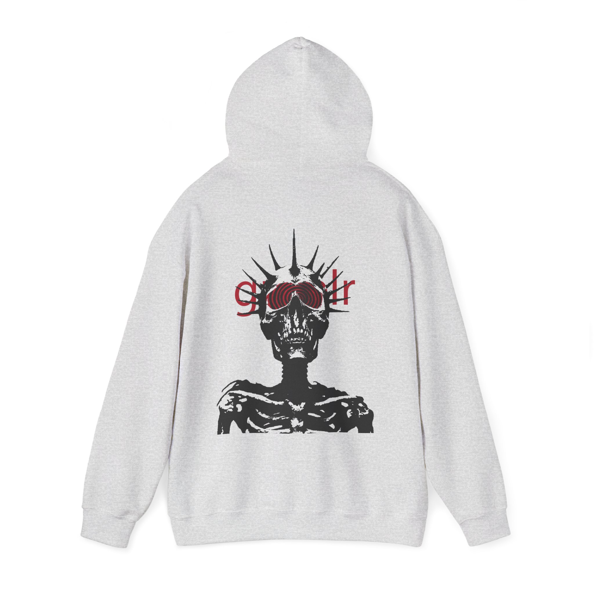 Soft, roomy, and quietly striking — this hoodie wraps you in cozy warmth while carrying a bold, underground vibe. The front bears a subtle, lowercase logo above the heart, while the back reveals a high-contrast skeletal figure crowned with spiked rays and layered red lettering. Wear it when you want comfort without blending in: layered over a tee for late-night walks, thrown on after rehearsal, or pulled up during long studio sessions. The pouch pocket keeps hands warm and the double-lined hood and color-matched drawcord add thoughtful, durable details. It’s made to live in — to be worn, washed, and worn again — and to hold up to the routines of creatives who prefer moodier, minimal statement pieces.