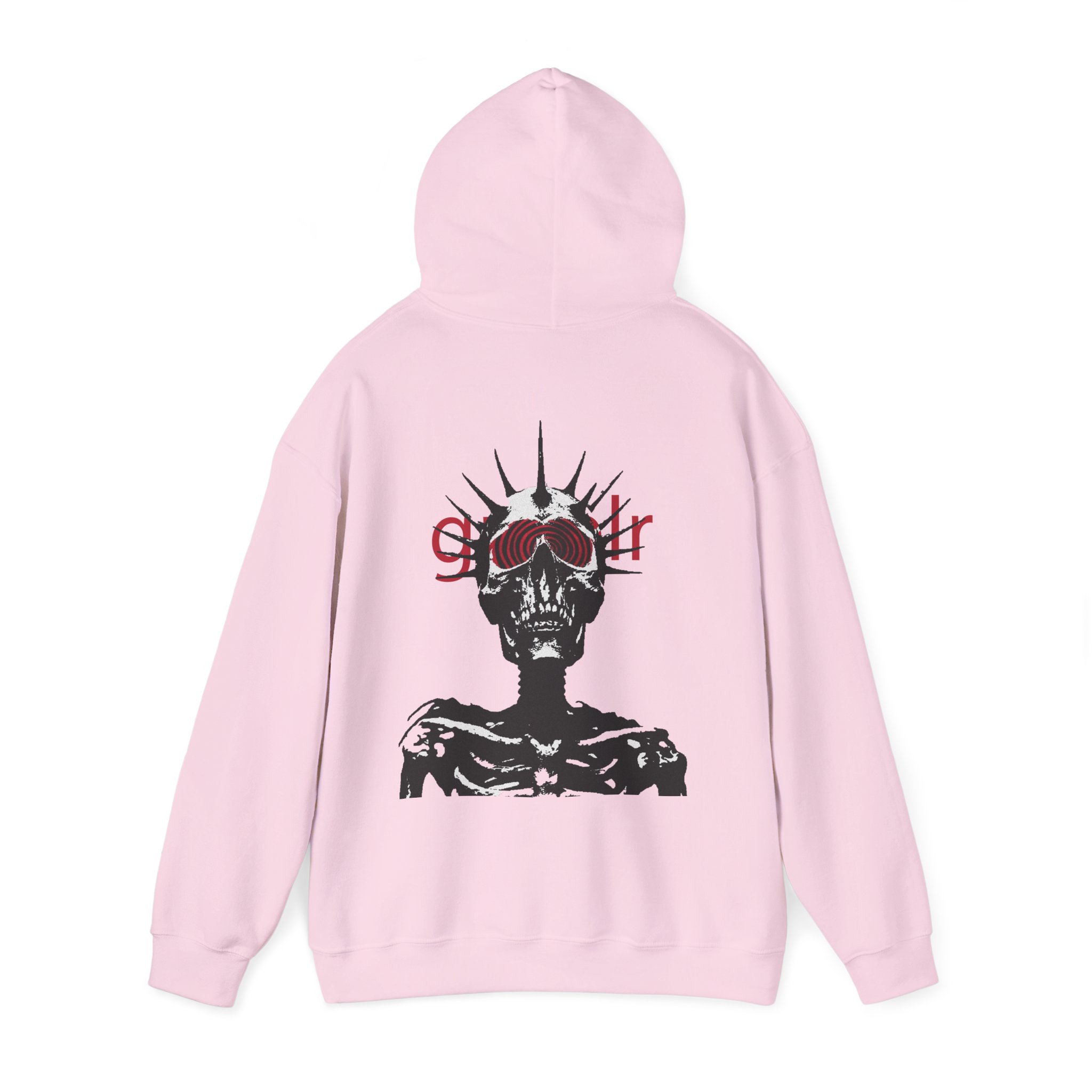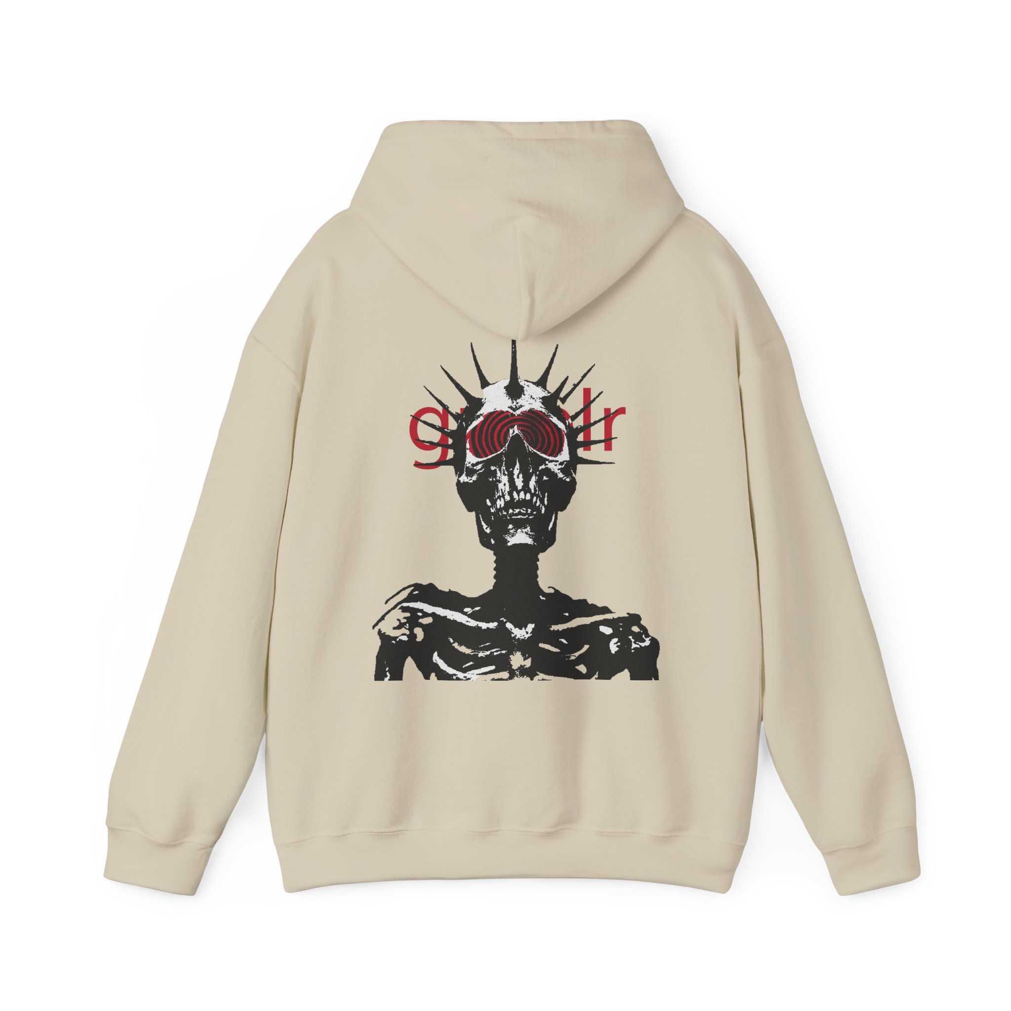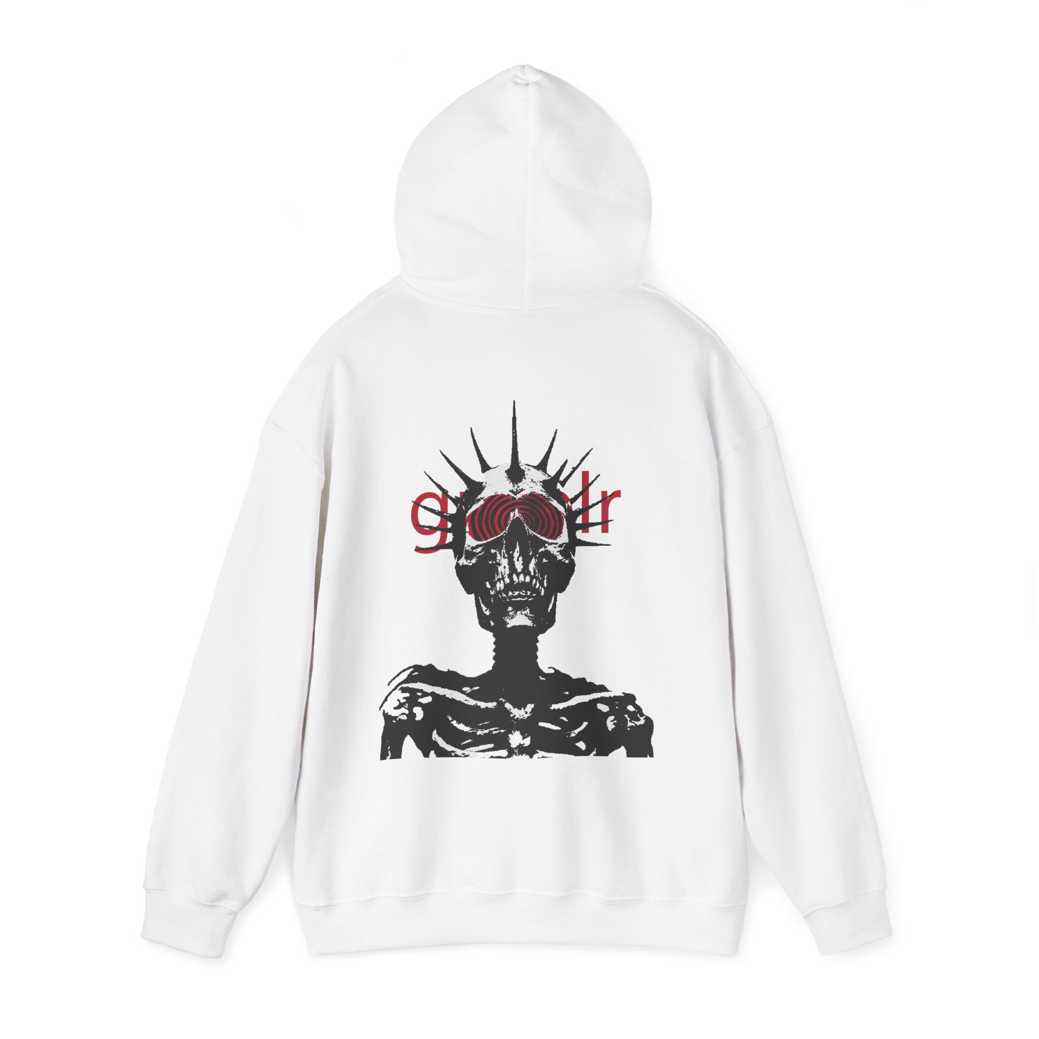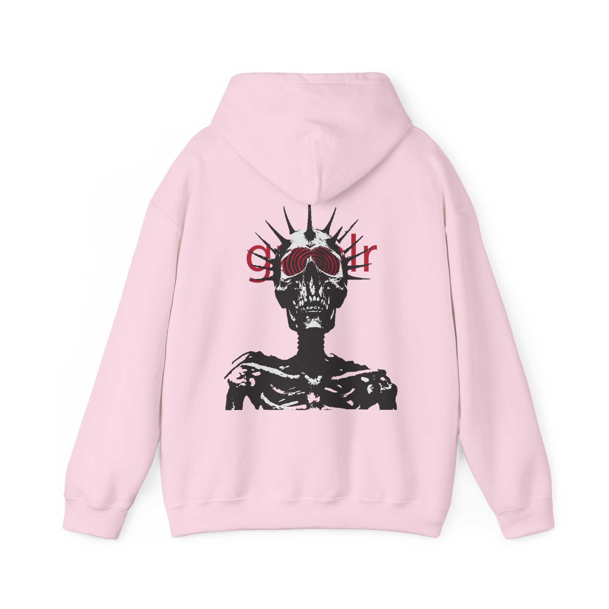 Soft, roomy, and quietly striking — this hoodie wraps you in cozy warmth while carrying a bold, underground vibe. The front bears a subtle, lowercase logo above the heart, while the back reveals a high-contrast skeletal figure crowned with spiked rays and layered red lettering. Wear it when you want comfort without blending in: layered over a tee for late-night walks, thrown on after rehearsal, or pulled up during long studio sessions. The pouch pocket keeps hands warm and the double-lined hood and color-matched drawcord add thoughtful, durable details. It’s made to live in — to be worn, washed, and worn again — and to hold up to the routines of creatives who prefer moodier, minimal statement pieces.